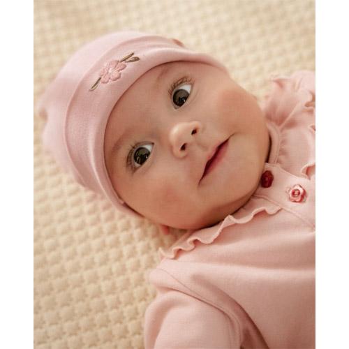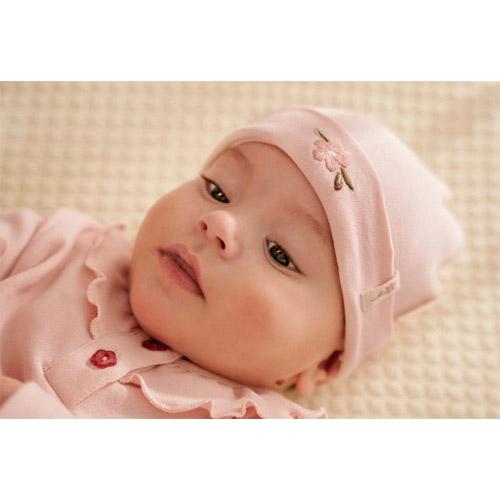 Met een klein geborduurd bloemetje op de omgeslagen rand is dit mutsje de charmante finishing touch van de outfit van je baby.