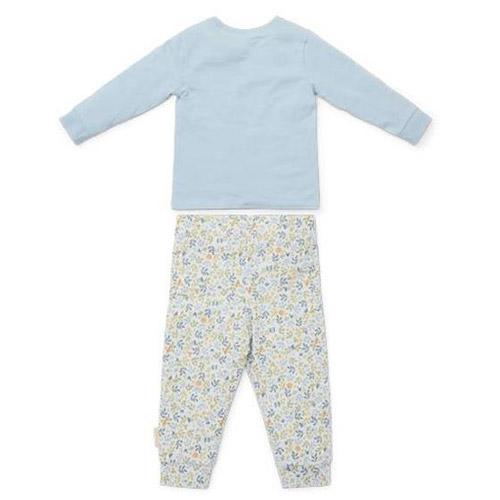 De lichtblauwe broek heeft een charmante print van blaadjes, uiltjes en andere vondsten uit het bos en het effen lichtblauwe shirt is versierd met een uil en zijn eekhoornvriendje.