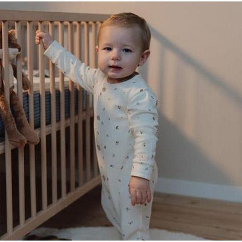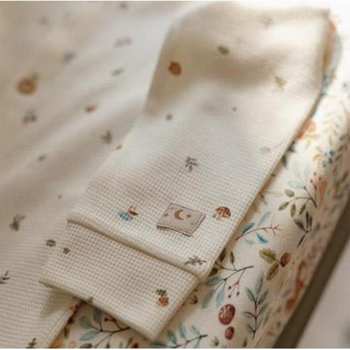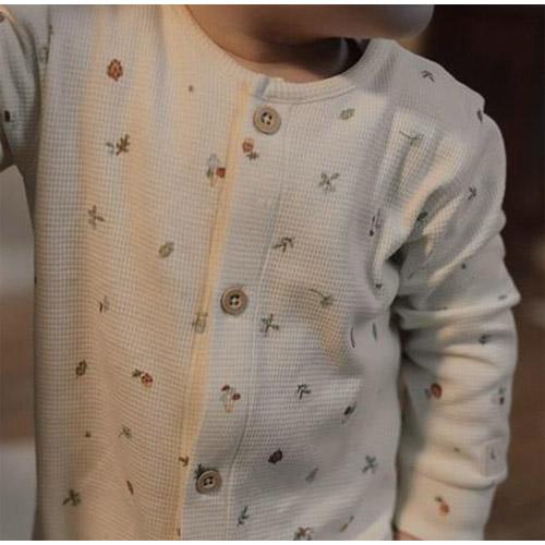 Deze onesie heeft een charmante wafelstructuur en een prachtige print van kleine bosvondsten, waardoor de magie van de natuur naar de dromen van je kleintje wordt gebracht.