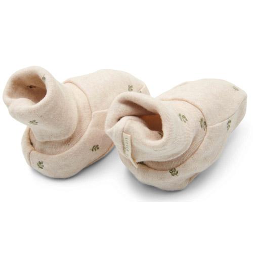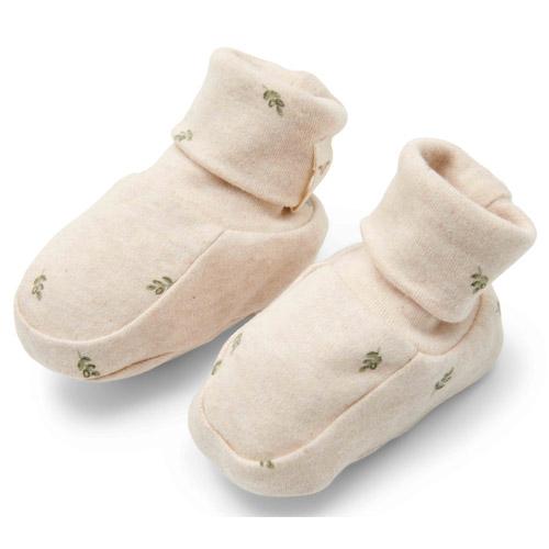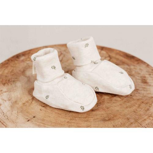De schattige print van groene blaadjes op een zandkleurige melange ondergrond geeft de slofjes een natuurlijke look.