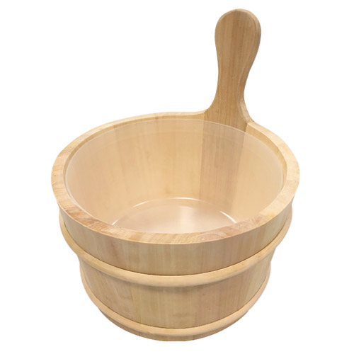 Sauna -emmer van natuurlijk espenhout met houten rand en kunststof inzetstuk.