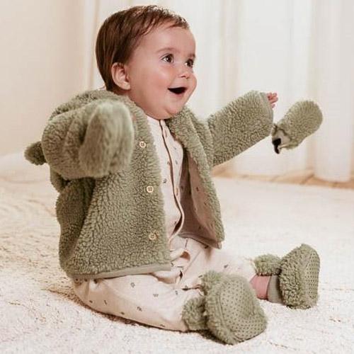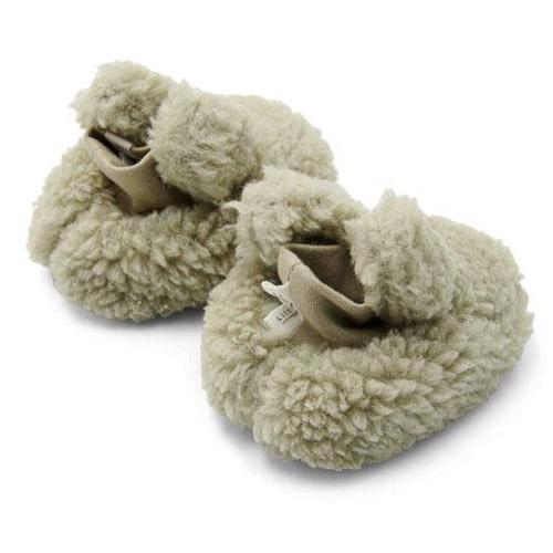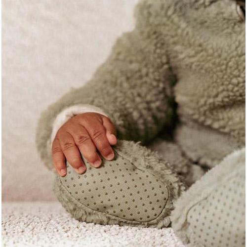 Gemaakt van zacht en warm teddymateriaal in een zachte groene kleur, zijn ze gevoerd met biologisch katoen met een speelse print van kleine blaadjes aan de binnenkant.