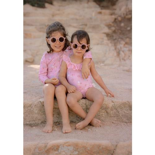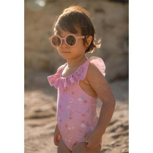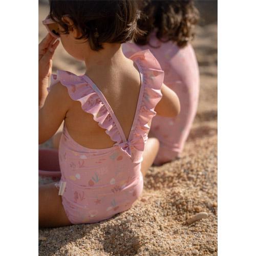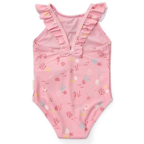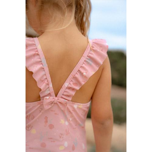 Het Sunny Flowers-badpak heeft een zoete lichtroze kleur versierd met zeepaardjes, koraal en schelpen, waardoor een prachtig onderwaterthema ontstaat.