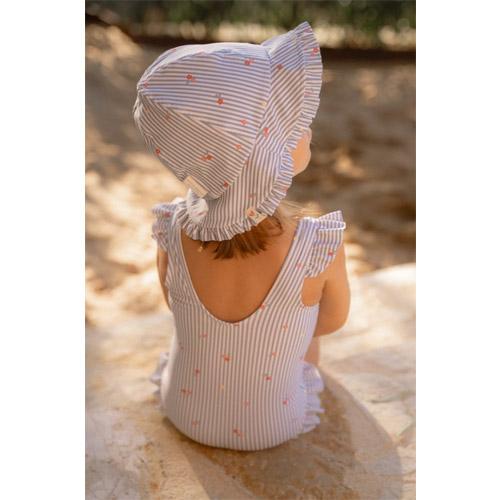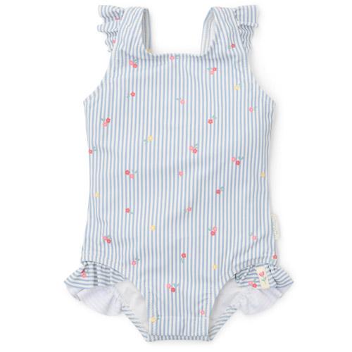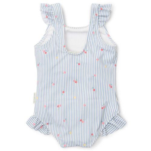 Dit mooie badpak heeft een fijn dessin van blauwe en witte streepjes versierd met kleine roze bloemetjes.