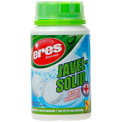 De ontsmettende bruistabletten van Eres Javel Solid reinigt, ontsmet, zuivert en ontgeurt.
