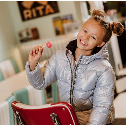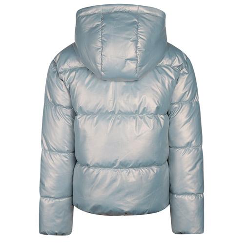 De meisjesjas met capuchon heeft een stoer lichtblauwe metallic glansje en is heerlijk gewatteerd voor extra warmte.