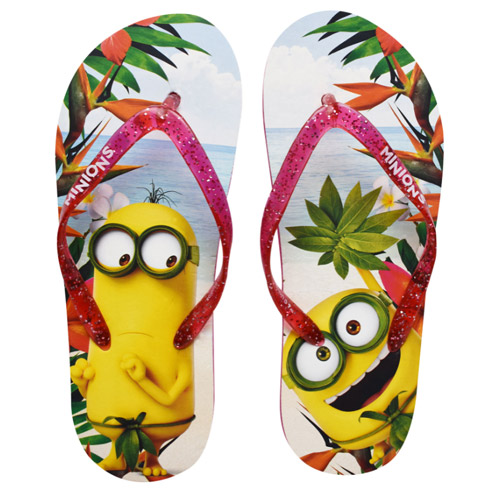 Roze teenslippers van de Minions met op de ene voet een afbeelding van Kevin uit de Minions en op de andere voet een afbeelding van bob.