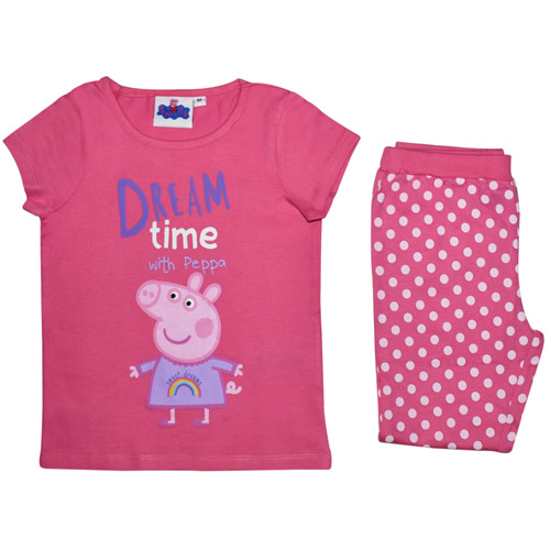 Lichtroze pyjama van Peppa Pig, bestaat uit twee delen een T-shirt met korte mouwen en lange broek met elastische taille.