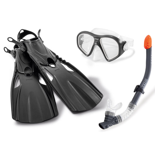 Reef rider sportset van Intex is een set voor kinderen met onder andere zwemvliezen ( medium), duikbril en snorkel.