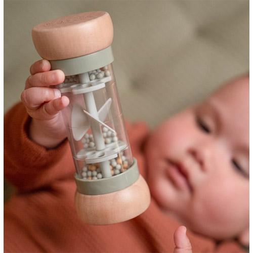 De regenrammelaar is ontworpen voor kleine handjes en ligt lekker in de hand.