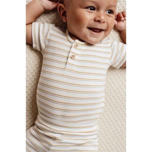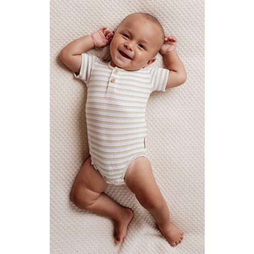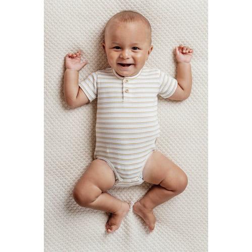 Gemaakt van zacht biologisch katoen met een fijne geribbelde textuur, biedt het een nauwsluitende maar flexibele pasvorm, perfect voor de dagelijkse avonturen van je baby.