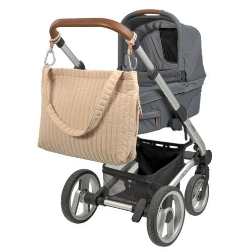 Dankzij de praktische D-ringen aan de zijkanten kan de tas met extra kinderwagen halen aan de kinderwagen worden bevestigd.