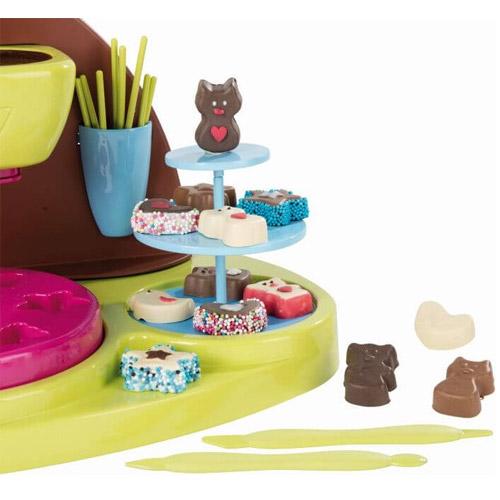 De fabriek bestaat uit de chocoladetap, een ronddraaiend wiel met vormpjes, een etagère en een speciaal decoratieplateau.