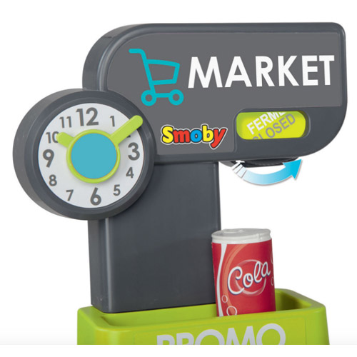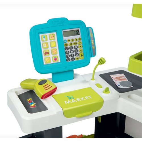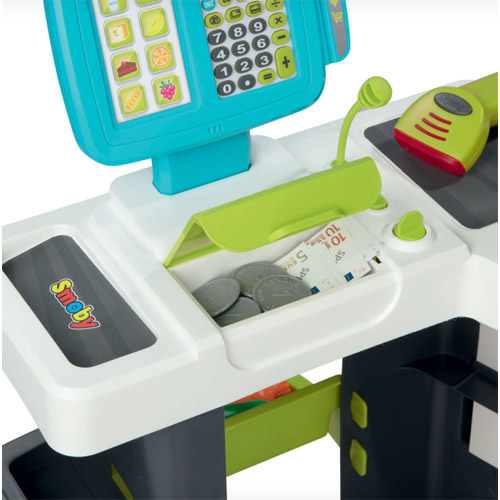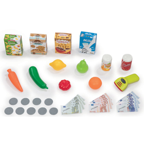 Inclusief 34 accessoires: 4 dummy dozen ( pasta, koekjes, ontbijtgranen, melk), 6 stukken fruit en groeten, 2 blikjes1 elektronische barcodelezer met licht en geluid, muntstukken en bankbiljetten en 1 winkelwagen.