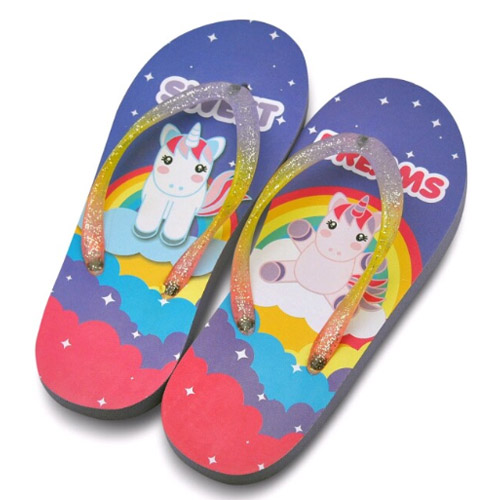 Elke teenslipper heeft een afbeelding van een unicorn en is afgewerkt met glitters.