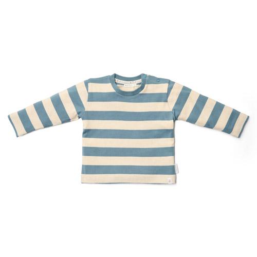 Geef je kleine avonturier een stijlvolle start met dit blauw - zand gestreepte T-shirt van Little Dutch.