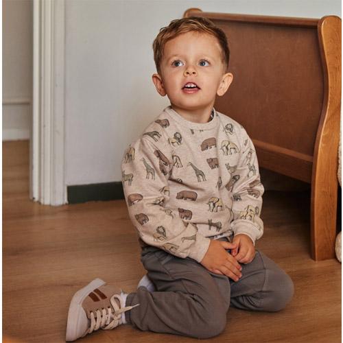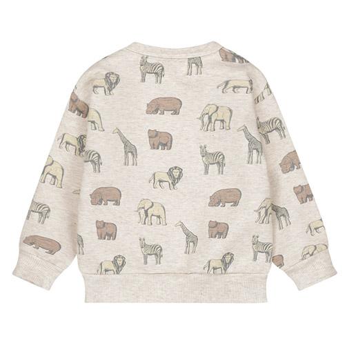 De lichtbruin gemêleerde kleur geeft de trui een warme uitstraling, terwijl de toffe print met wilde dieren hem een avontuurlijke twist geeft.