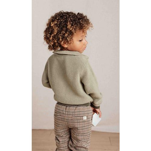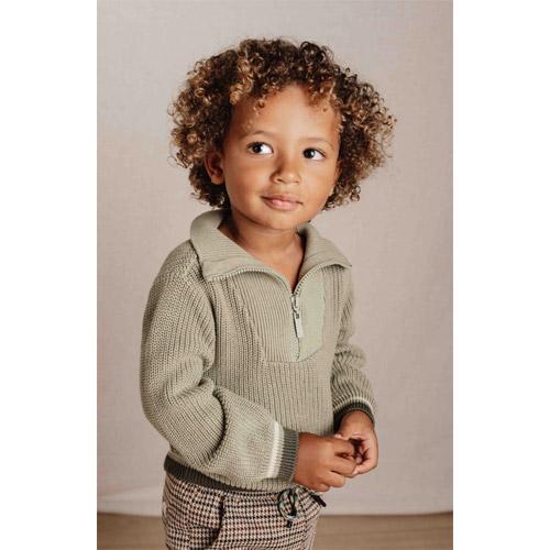 Deze gebreide trui in een natuurlijke groene tint is gemaakt van biologisch katoen en heeft een stoere ritssluiting met kraag.