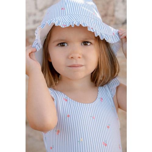 Het hoedje heeft een brede rand met schattige ruches langs de rand voor optimale zonbescherming, zodat je kleintje zonnige dagen aan het strand of bij het zwembad in stijl en comfort kan doorbrengen.