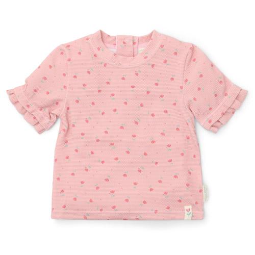 Dit schattige zwemshirt heeft een mooie lichtroze basis met overal kleine bloemetjes.