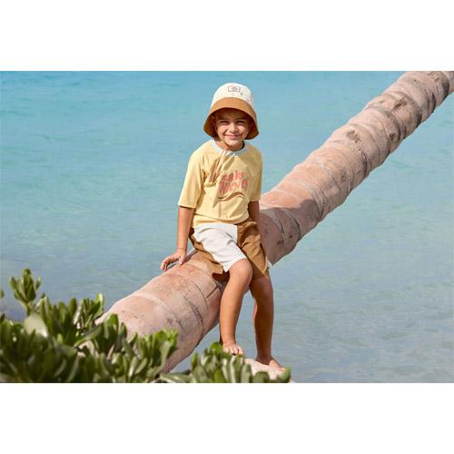 Het gele UV-shirt met korte mouwen voor kinderen met UV-bescherming 60, heeft een zonnige opdruk en is gemaakt van extra zachte stof.