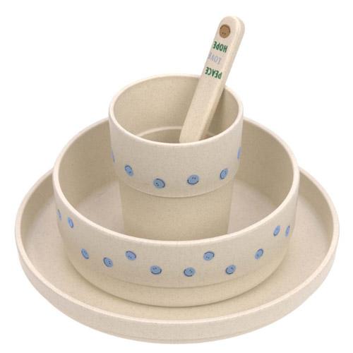 De set bevat een bord, een kommetje, een beker en een lepel.