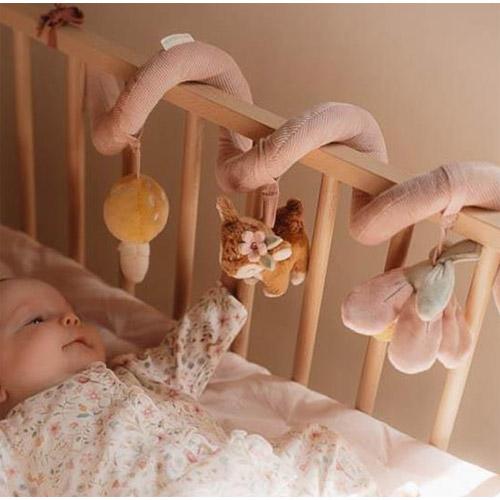 De activiteitenspiraal is gemaakt van corduroy met katoen en draait om een klein hertje, een paddenstoeltje en een mooie bloem.