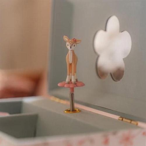 Na het opwinden speelt er bij het openen van het doosje muziek en begint er een hertje voor de spiegel te dansen.