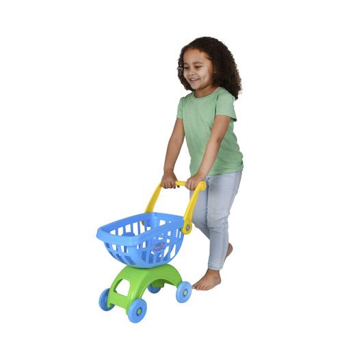 Met deze set kunnen kinderen boodschappen doen in hun eigen mini supermarkt : winkelwagen, kassa, betaalterminal, nepgeld en bankkaart.