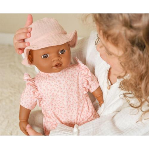 Om deze charmante outfit compleet te maken, zit er een schattig roze zonnehoedje bij.