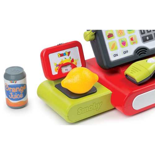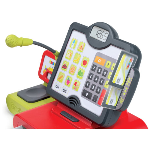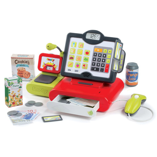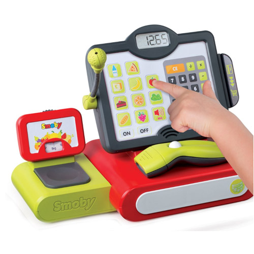 Geldlade, touchscreen weegschaal, rekenmachine, een echte microfoon en scanner: met deze elektrische kassa van Smoby heeft het allemaal!
