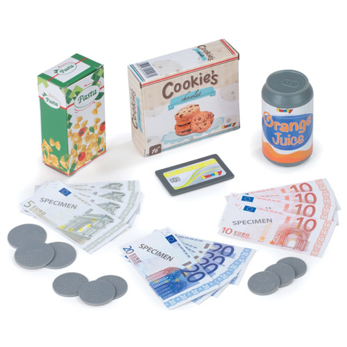 Bij de kassa zijn er 25 accessoires meegeleverd waaronder speelgeld, blikje en koopwaar.