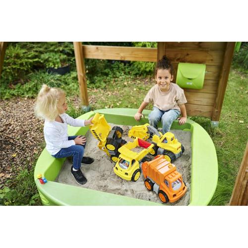 En met de energieke hulp van de bouwvakkersfiguur kan het werk in de zandbak beginnen.