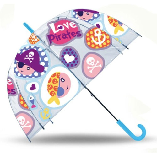 Je blijft droog terwijl het regent, met deze mooie doorzichtige Love pirates paraplu!De paraplu heeft een blauw handvat en een doorsnee van 47 cm.