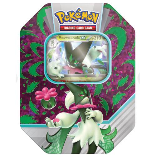 Pokémon kaart Meowscarada en 4 pakjes van 10 kaarten in tinnenbox