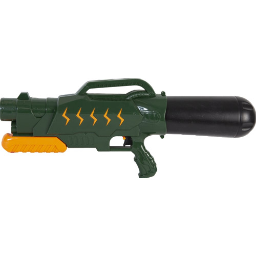 Water pistol in army colours: green, black and orange.